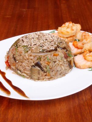 Wok de arroz salmon y langostinos