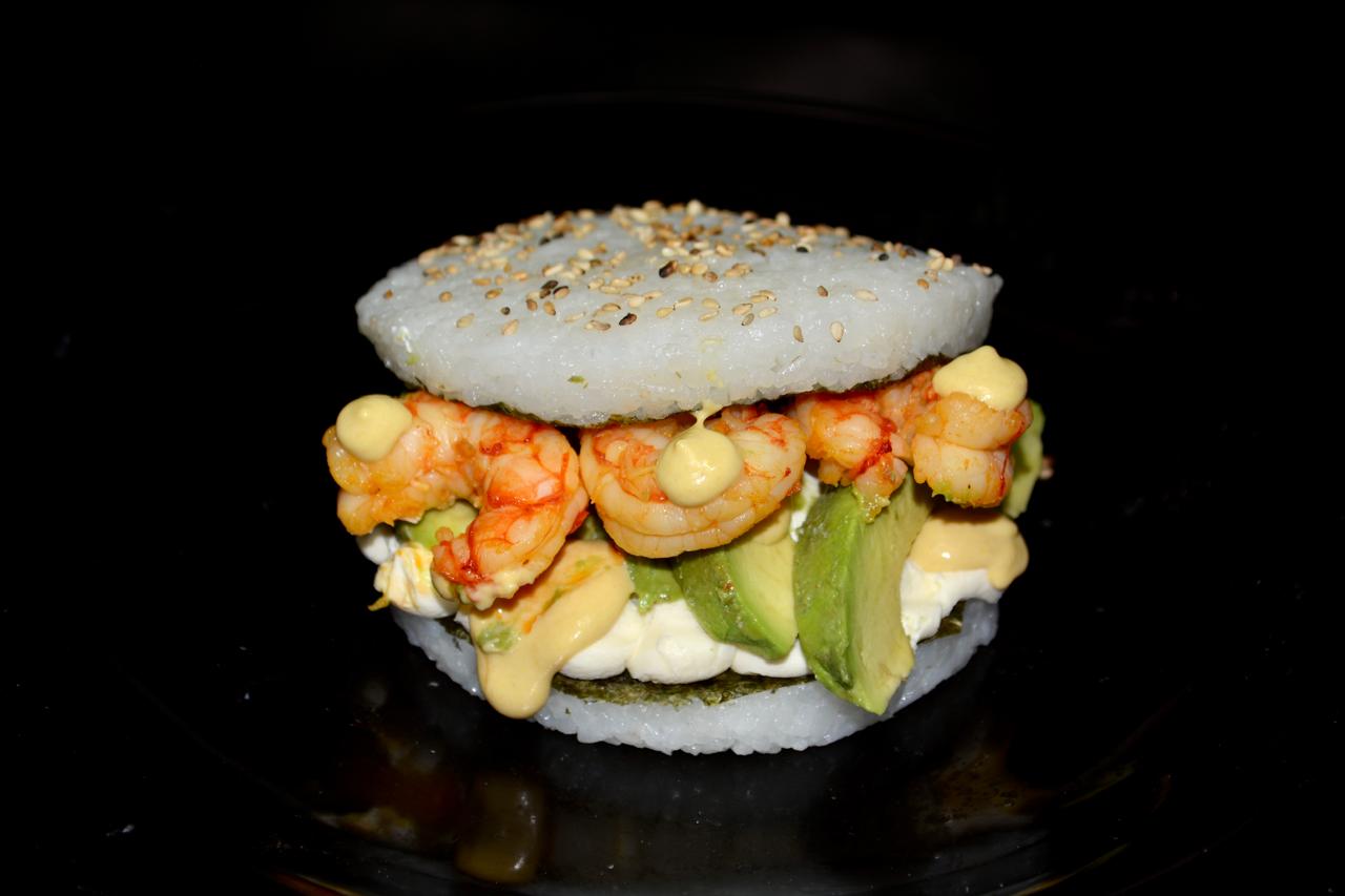 Arroz en forma de pan relleno de langostinos, queso, palta y salsa huancaina cubierto de sesamo