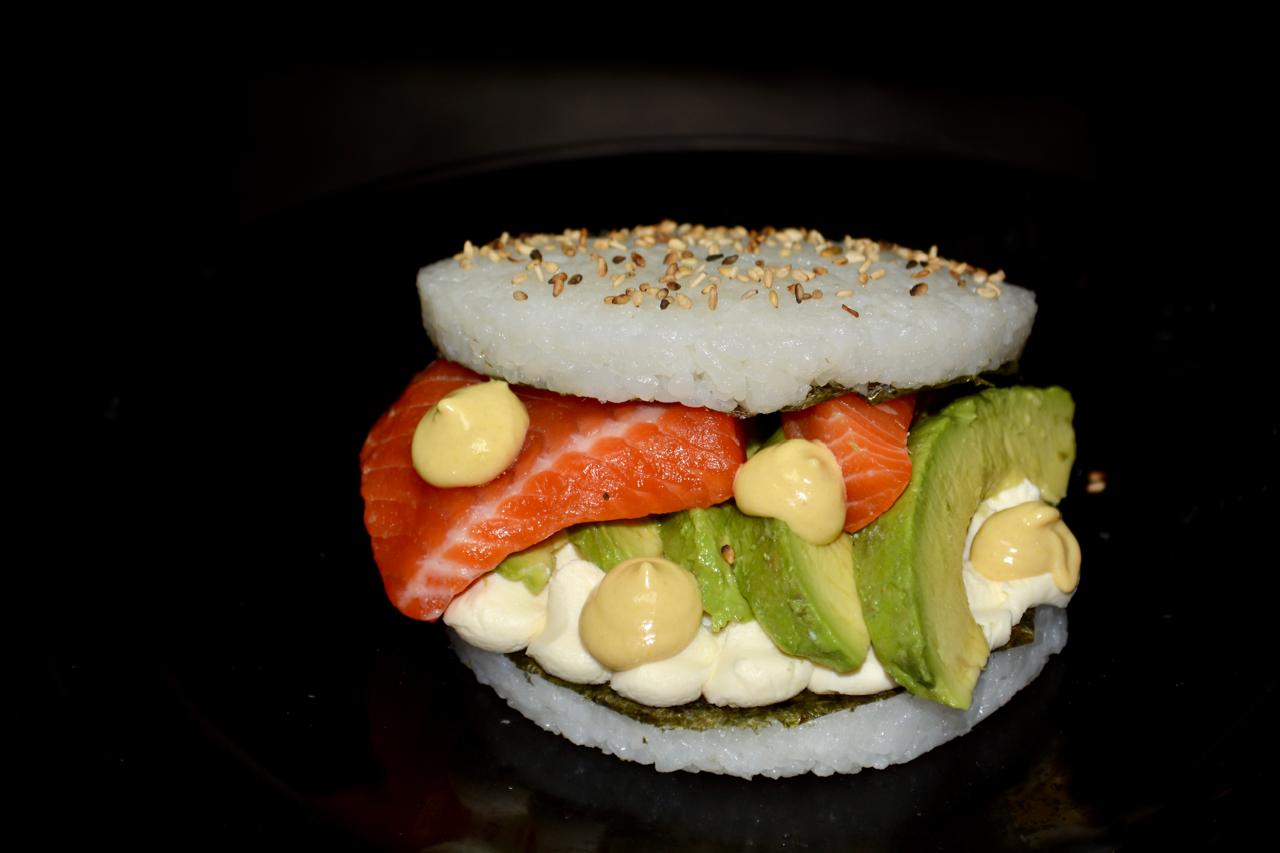 Arroz en forma de pan relleno de salmon, queso, palta y salsa huancaina cubierto de sesamo